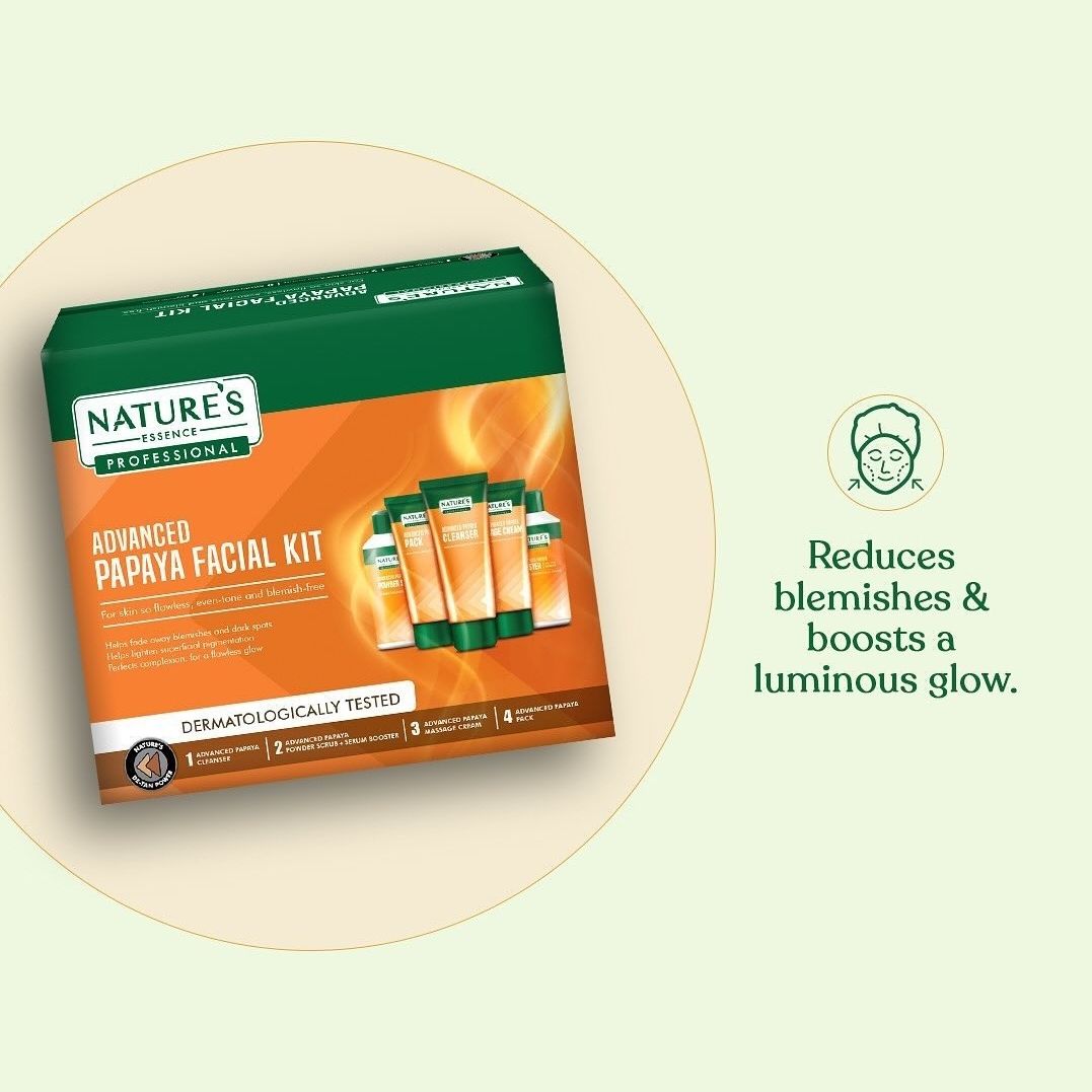 Nature's Essence Papaya Facial Kit is a 60 min. ritual for flawless, blemish free skin. This facial kit made with ace quality papaya extract reduces blemishes and pigmentation. Papaya enzymes work in the deeper layers of the skin fading away dark spots and acne scars while olive oil and wheat germ oil nourish & brighten the skin from within. Celebrated as a natural skin brightening ingredient, this papaya-enriched facial kit is an effective way to get flawless skin in just 4 steps. Flawless skin that will make heads turn! The kit contains a cleanser, dry scrub, serum, massage cream, and a face pack.