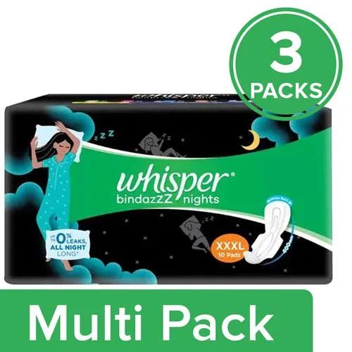 Whisper Bindazzz Nights gives you no. 1 night protection. Its longer length and wider back ensure that you are protected from leaks from all sides. With this, you can have a worry-free sleep during your periods because with this pad you get up to 0% leaks all night long. It has a dual-action gel that neutralises odour and locks wetness. Its dry-weave cover ensures that the period blood is absorbed in seconds so that you sleep comfortably the entire night.