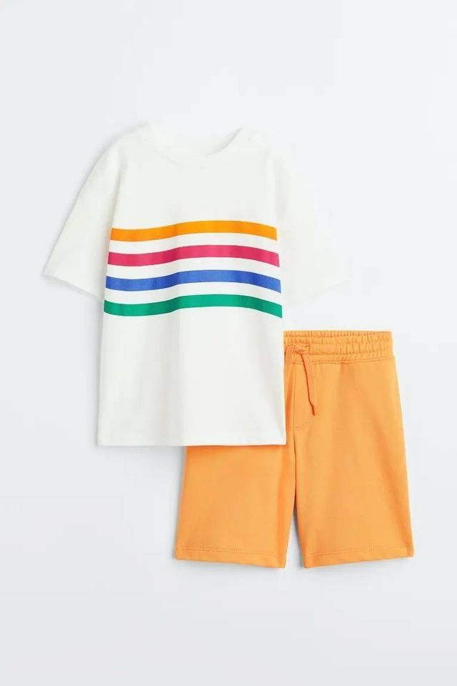 Set with a T-shirt and pair of shorts in soft cotton fabric. T-shirt in jersey with a ribbed trim around the neckline. Knee-length shorts in lightweight sweatshirt fabric with covered elastication and a drawstring at the waist, and pockets in the side seams.
