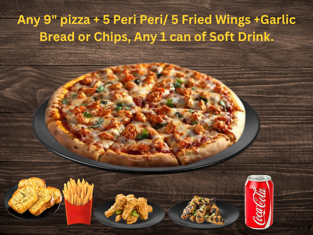 Any 9" pizza, Garlic Bread or Chips+ 5 wings peri peri/fried + can drink.