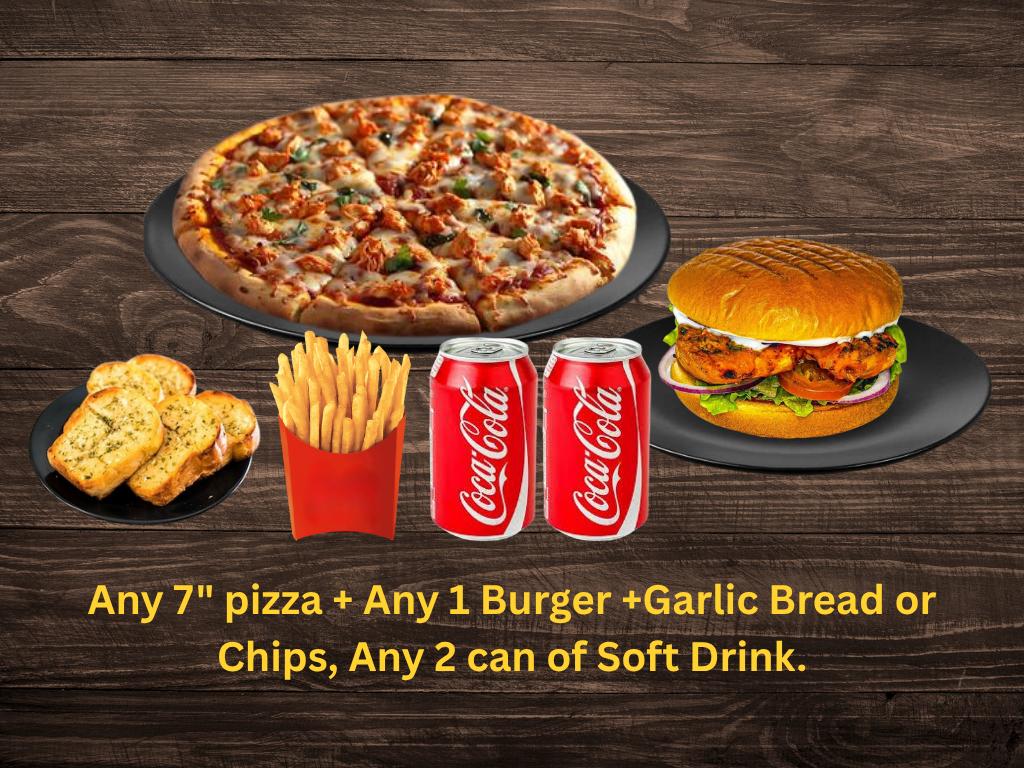 Any 7" Pizza + Garlic Bread or Chips + Any 1 Burger + 2 can of Soft Drink.