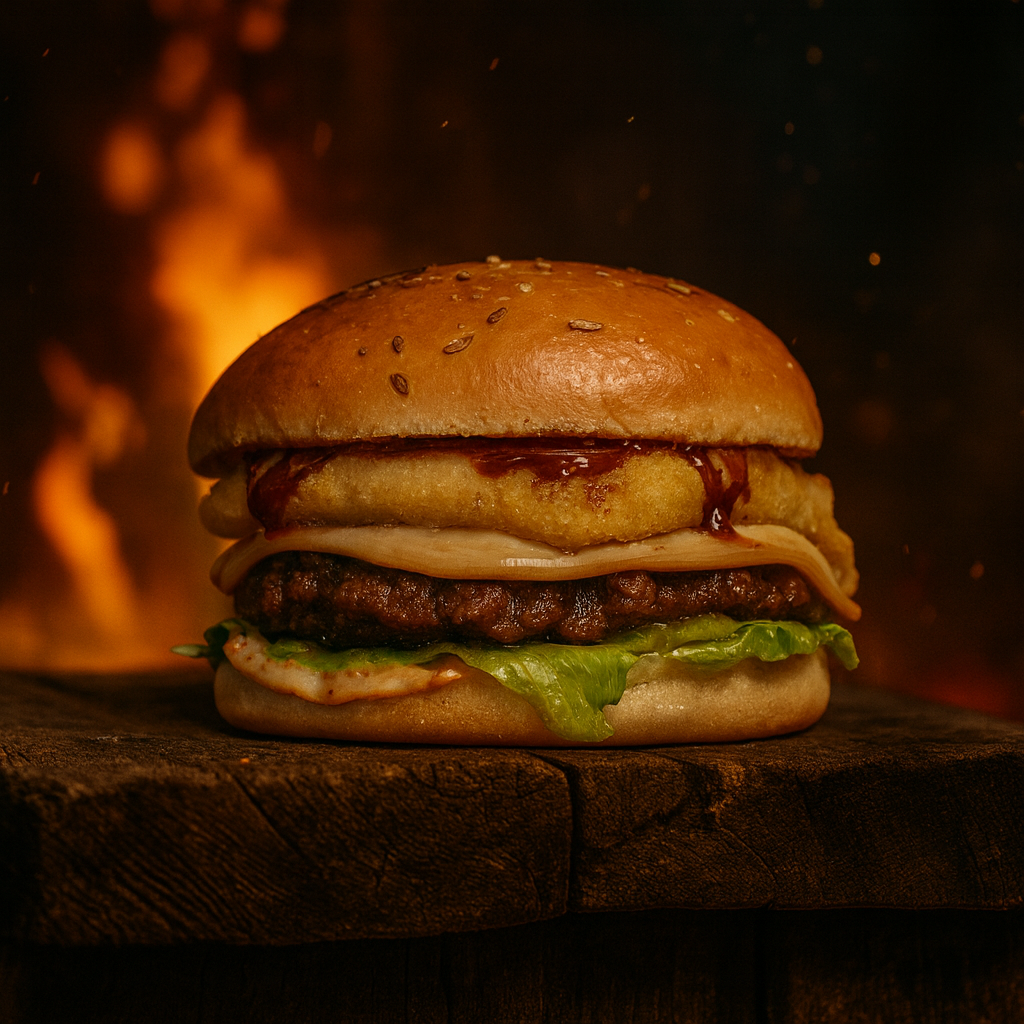 Beef patty, cheddar patty, turkey slice, swiss cheese, iceberg, dill pickles, bbq and cocktail sauce