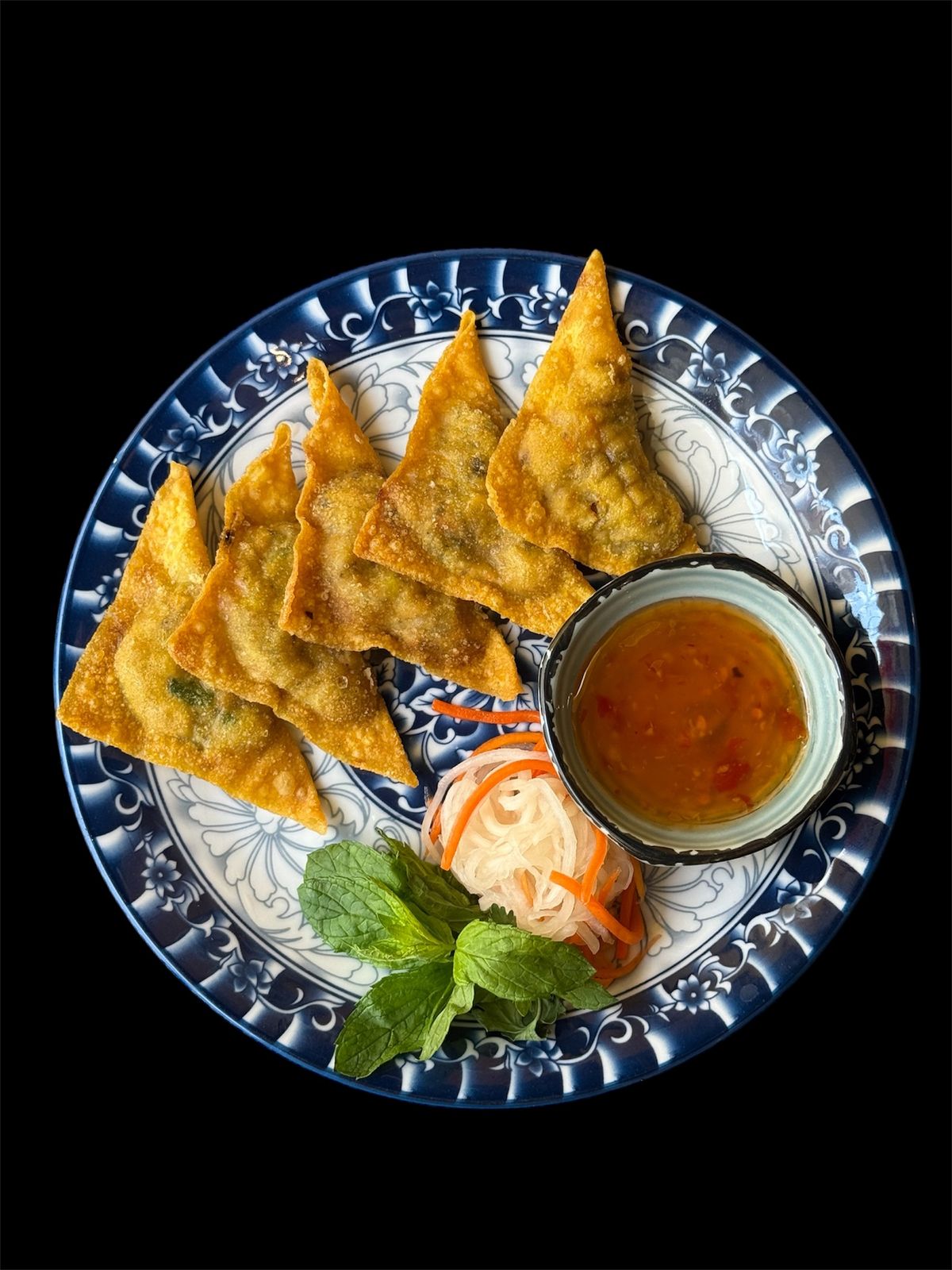 Crispy fried wontons with a thin golden wrapper, filled with a savory mix of fresh mushroom and vegetables