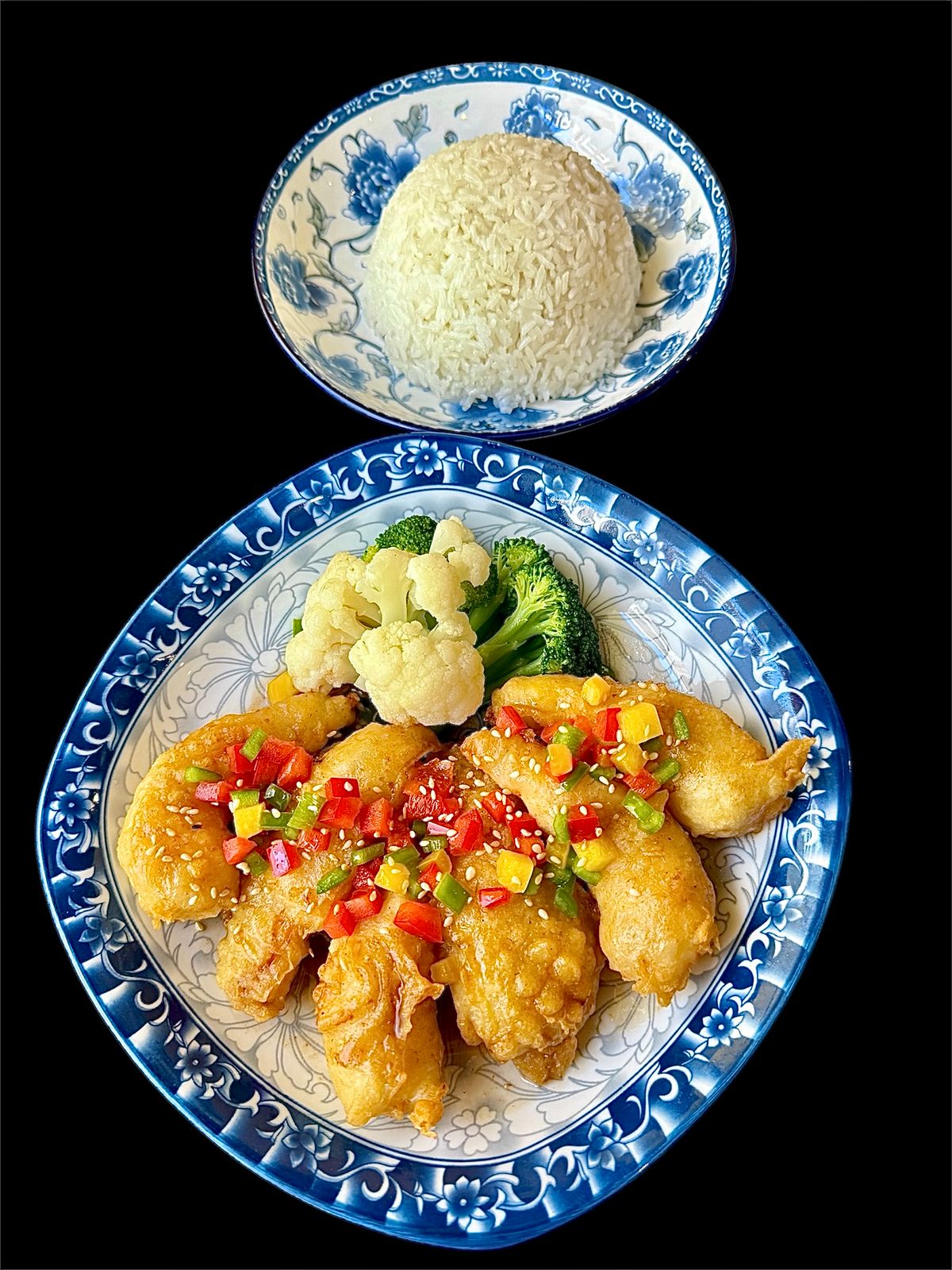 Wok toss king prawn with vegetables, chili , ginger and tamarind sauce served with steamed rice.