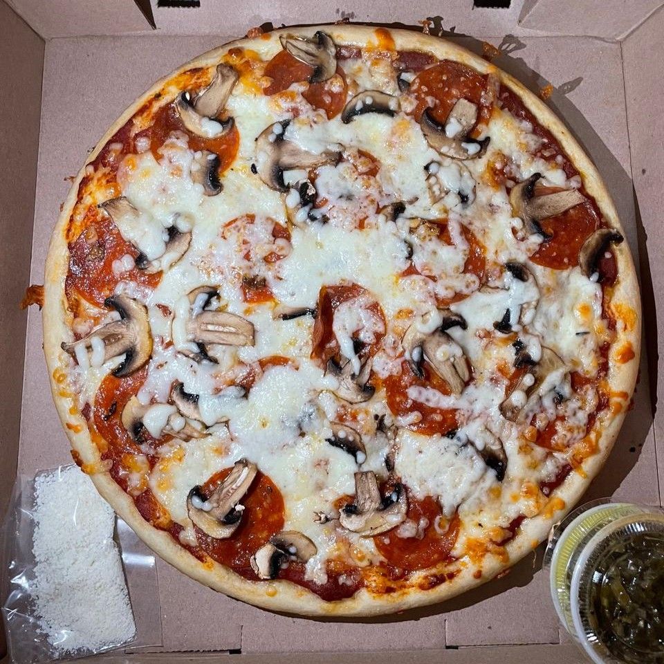Peperoni, Champiñones, Pim.Verde, y Cebolla.