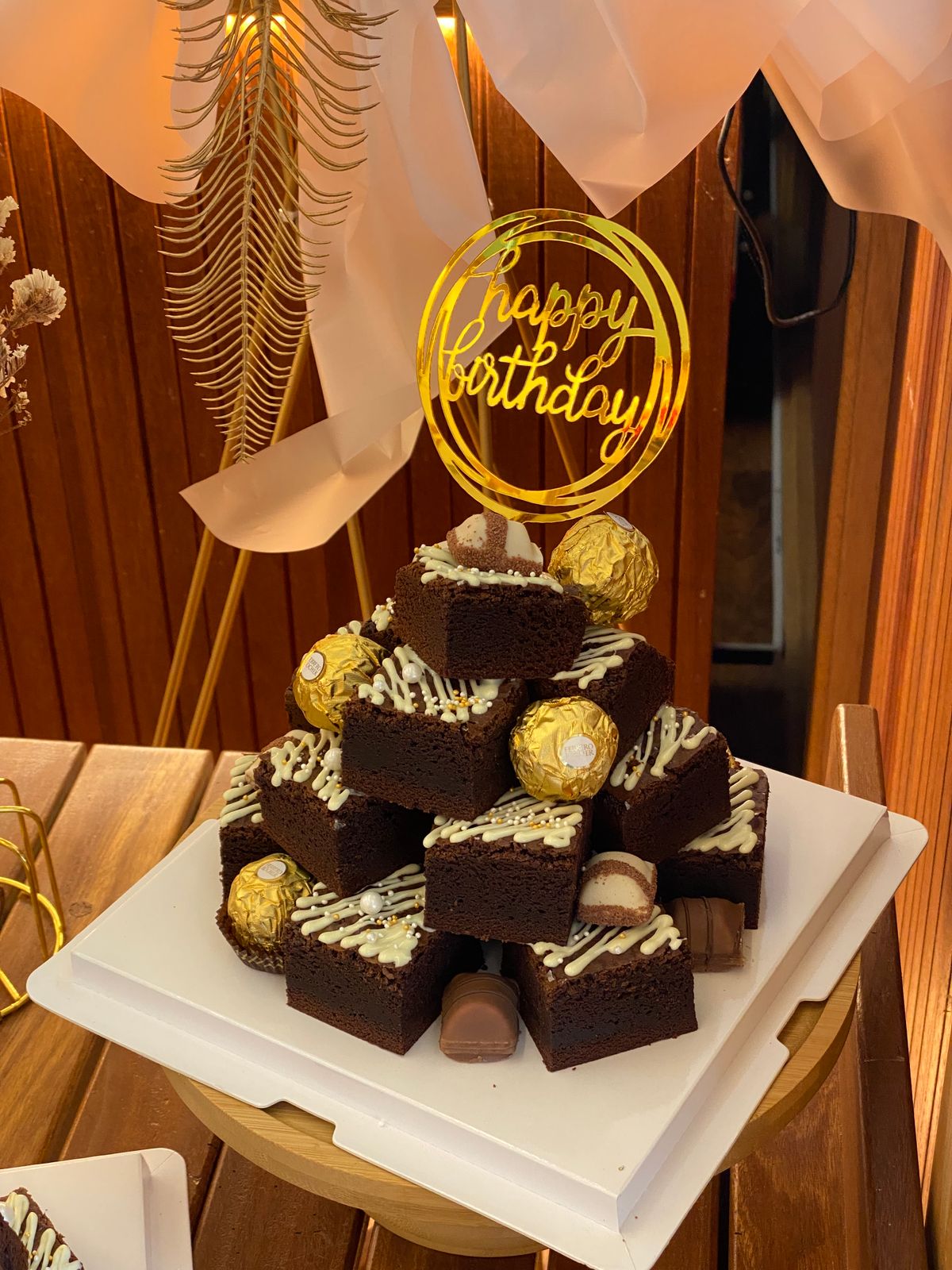 A delectable masterpiece made with 16 fudgy brownie pieces, stacked to perfection. Customize your tower with Nutella sauce, Lotus Biscoff sauce, or White Chocolate sauce, or enjoy it plain. Adorned with Ferrero Rocher and Kinder Bueno, it's a sweet sensation that's sure to impress!