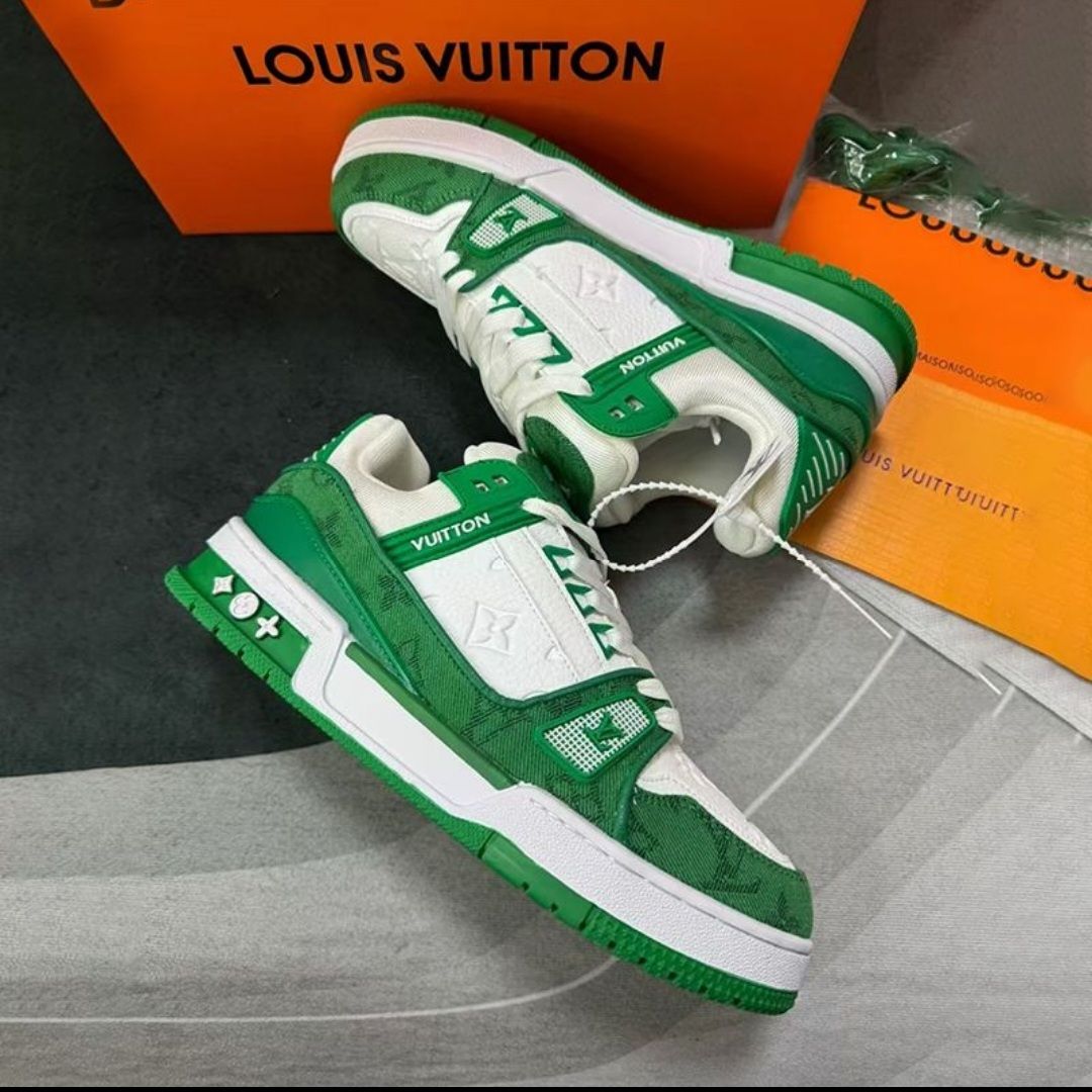 Presenting the Louis Vuitton Trainer Panda Sneakers, a fashionable blend of luxury and comfort. Designed with a striking green and white color scheme, these low-top sneakers feature an embossed print for a unique look. Made from high-quality materials, they are ideal for both casual outings and sporty activities.