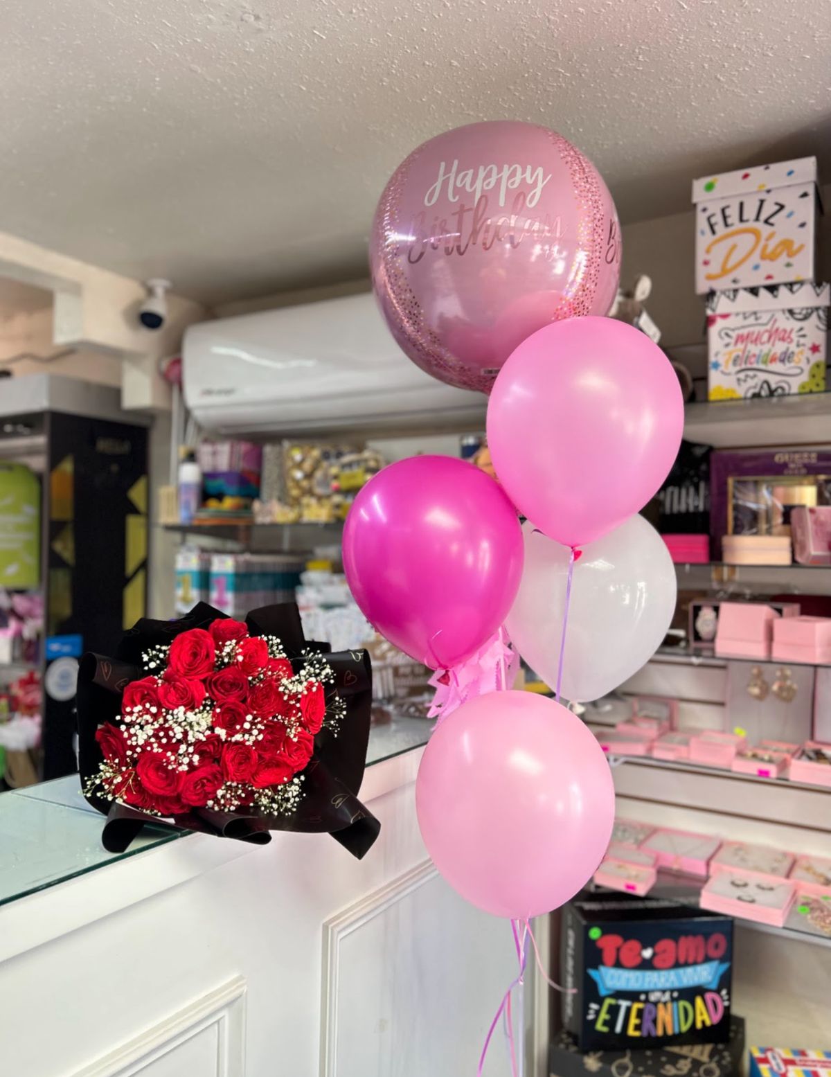 Ramo 24 rosas con globo Orbz, 4 globos látex con helio