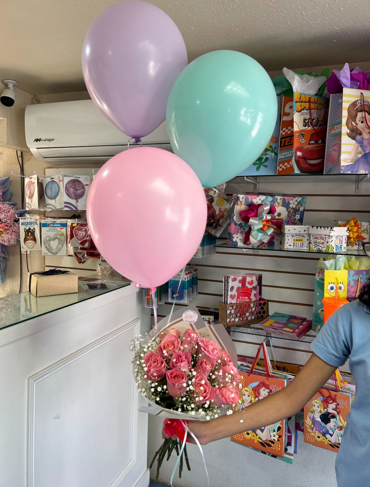 Ramo 12 rosas con follajes y 3 globos latex