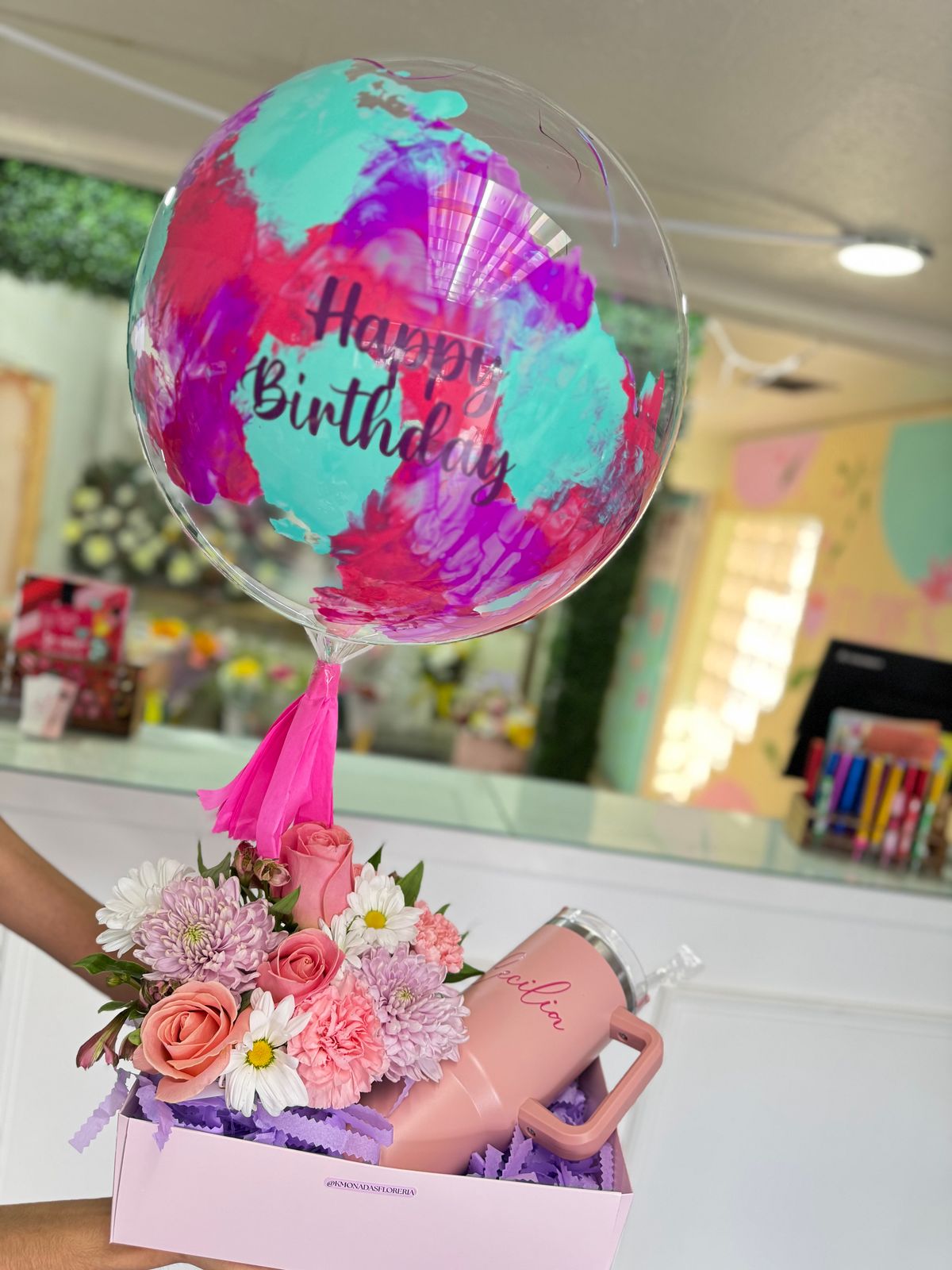 vaso 40oz, globo personalizado (sin helio), arreglo floral en su caja decorada