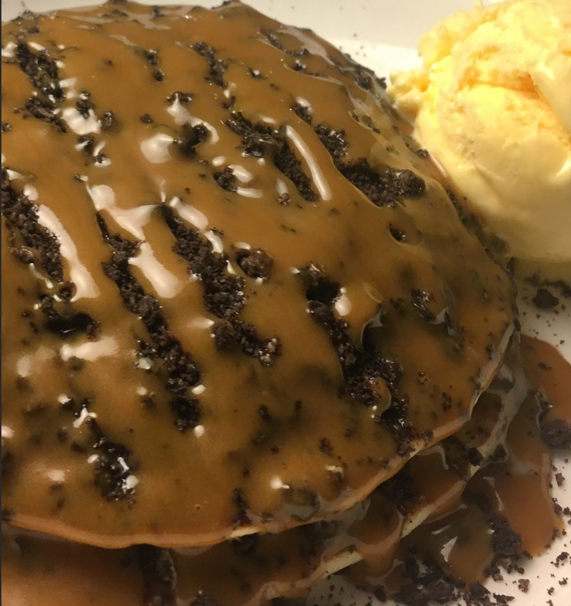 2 layer pancakes served with oreo crumbs, butterscotch sauce, white chocolate sauce & 1 scoop of vanilla ice cream.
