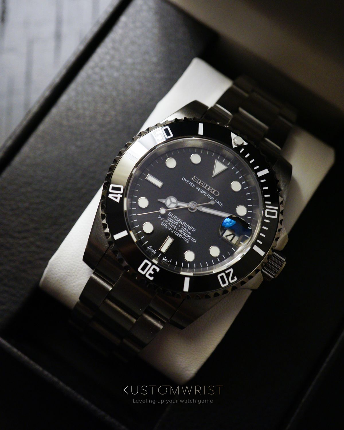 A masterfully crafted Seiko Submariner Mod, with its iconic 40mm case, made of luxurious 904L stainless steel for a timepiece that feels and looks luxurious.