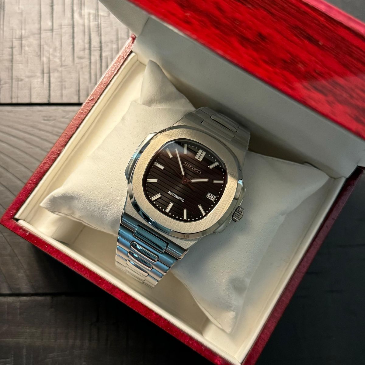 This Custom Seiko Nautilus Mod is masterfully crafted with a Seiko Naut case made of solid 316L stainless steel, 40mm diameter, and 44,7mm lug-to-lug, perfect daily wearability for all wrists