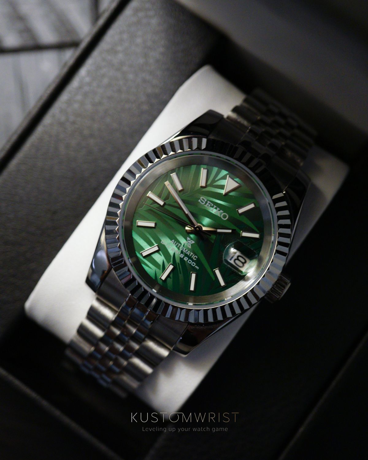 Automatic Seiko NH35 movement, with additional hand-winding and hacking, the premium version of the caliber made in Japan, 24 Jewels, 21,600 bph, 41 hours of power reserve, and a bi-directional rotor, for an advanced automatic movement made to run a lifetime.
