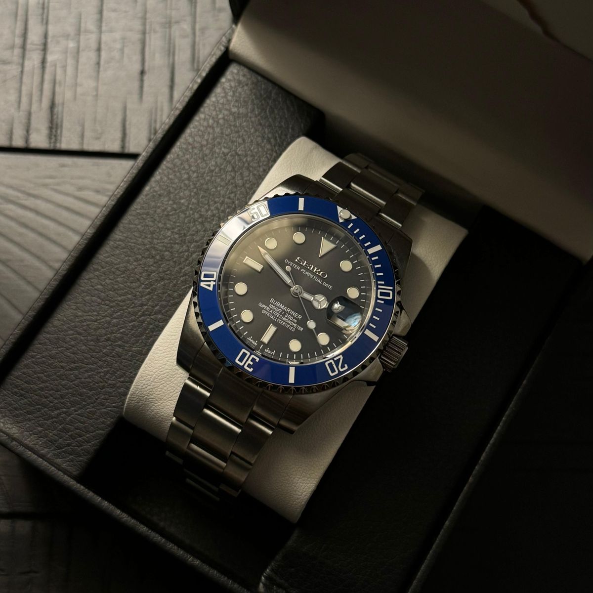 A masterfully crafted Seiko Submariner Mod, with its iconic 40mm case, made of luxurious 904L stainless steel for a timepiece that feels and looks luxurious.