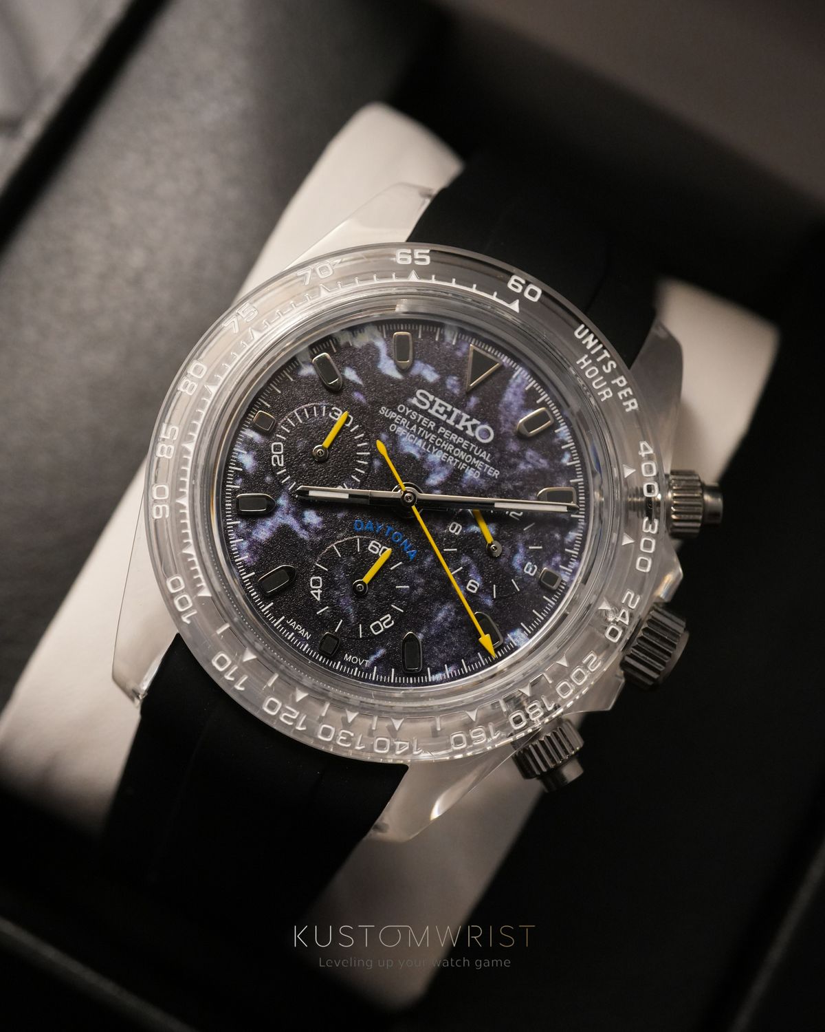40mm diameter, stunning clear case + see through caseback, for a watch that feels and looks luxurious.