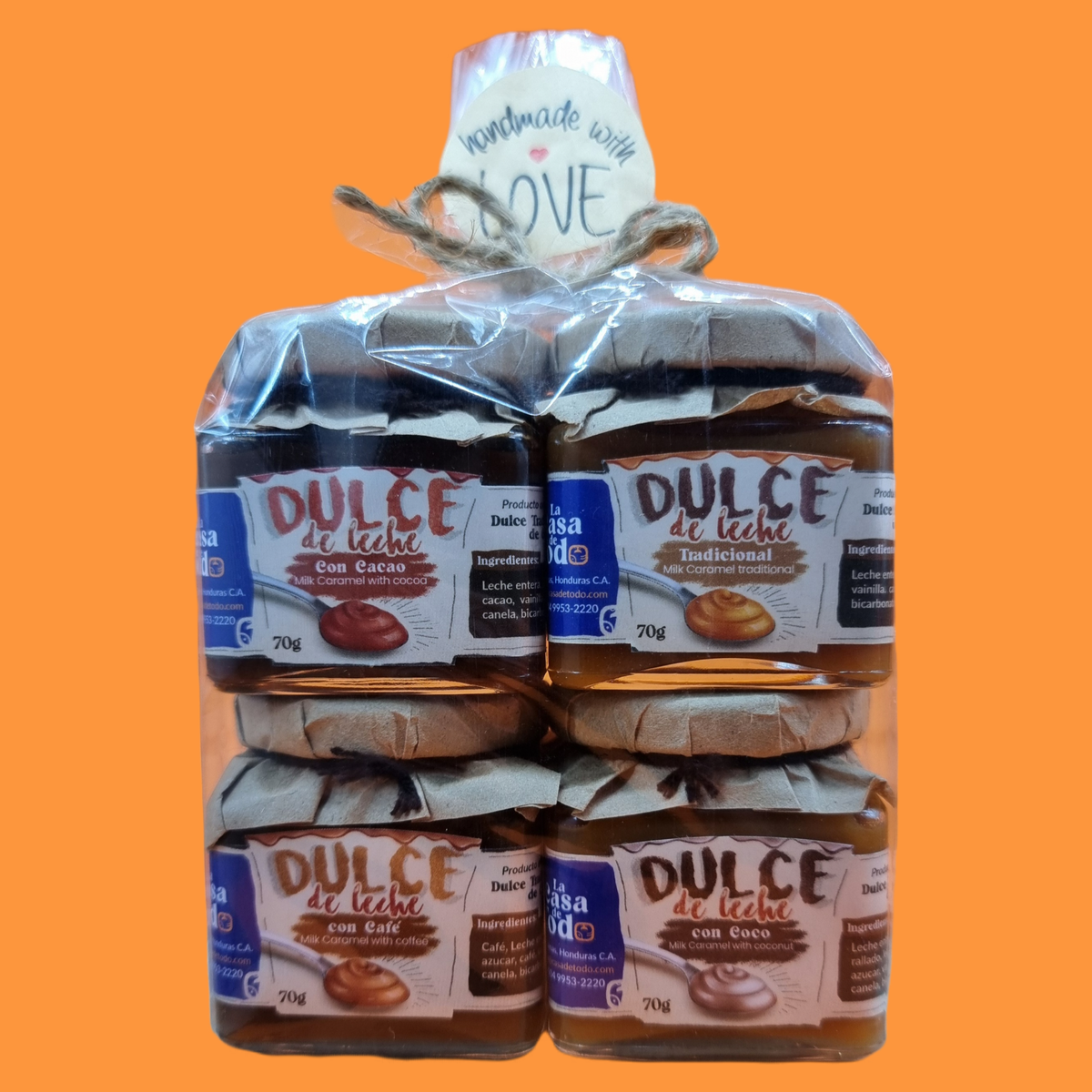 Paquete artesanal de 4 dulces de leche de 70 g cada uno, en los deliciosos sabores de coco, café, cacao y tradicional. Perfecto para disfrutar y compartir, o como un regalo especial que resalta el auténtico sabor de Copán Ruinas.