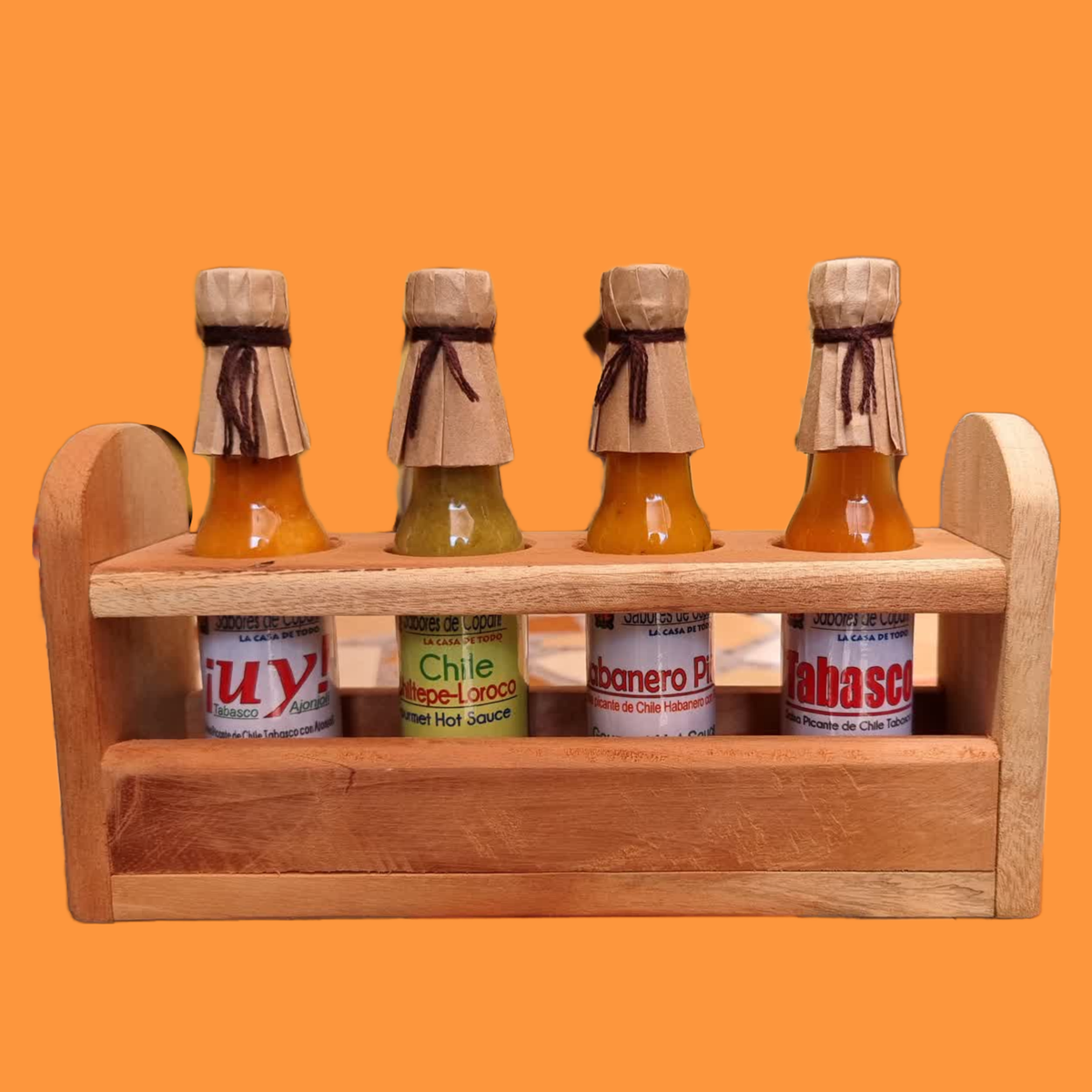 Set de 4 salsas picantes de tu preferencia (75 ml cada una) en caja de madera