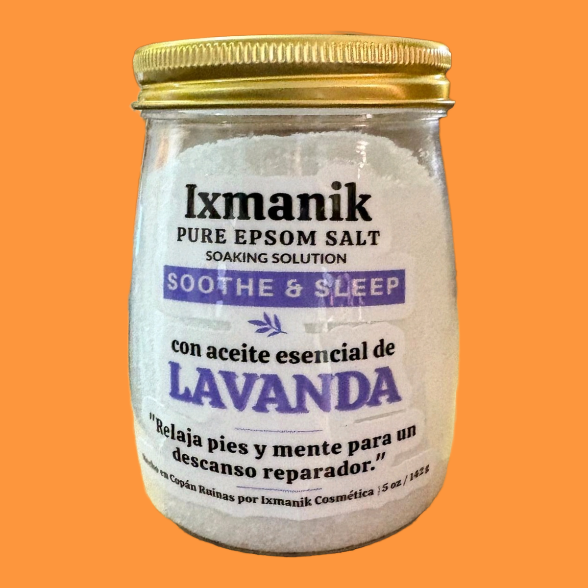Sal Epsom Lavanda por Ixmanik Cosmética, con aceite esencial de lavanda, elaborado en Copán Ruinas. Ideal para relajar pies y mente para un descanso reparador.