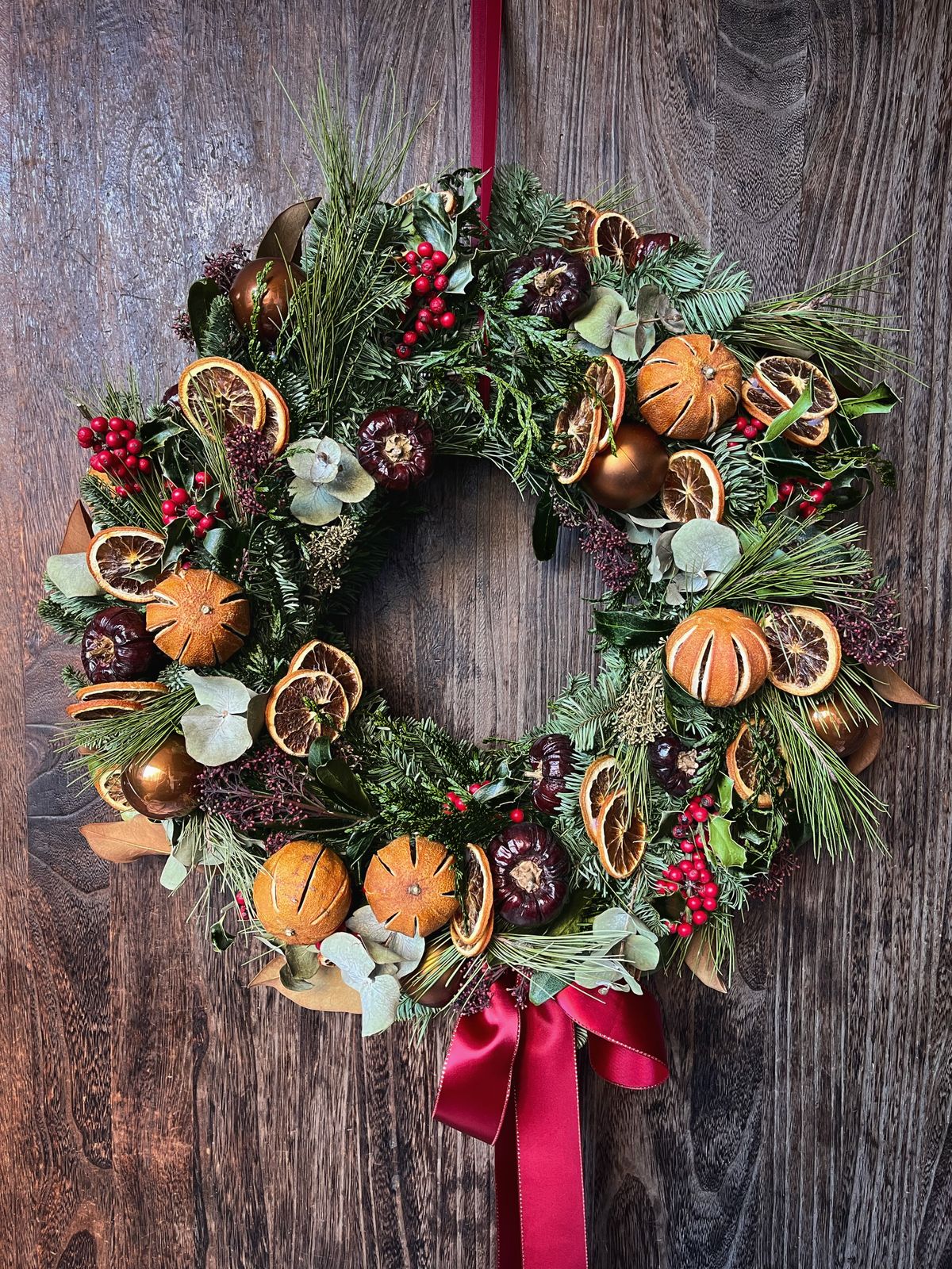Corona con un estilo invernal cálido, pensada para aportar color y textura a la temporada. La combinación de verdes y elementos secos crea un equilibrio bonito entre lo natural y lo festivo. Los cítricos deshidratados iluminan la pieza, mientras que los pimientos secos, el ilex y las hojas de magnolia aportan profundidad y contrastes suaves. Las bolas de Navidad añaden un acento festivo discreto y armonioso, integrado sin romper la estética artesanal.