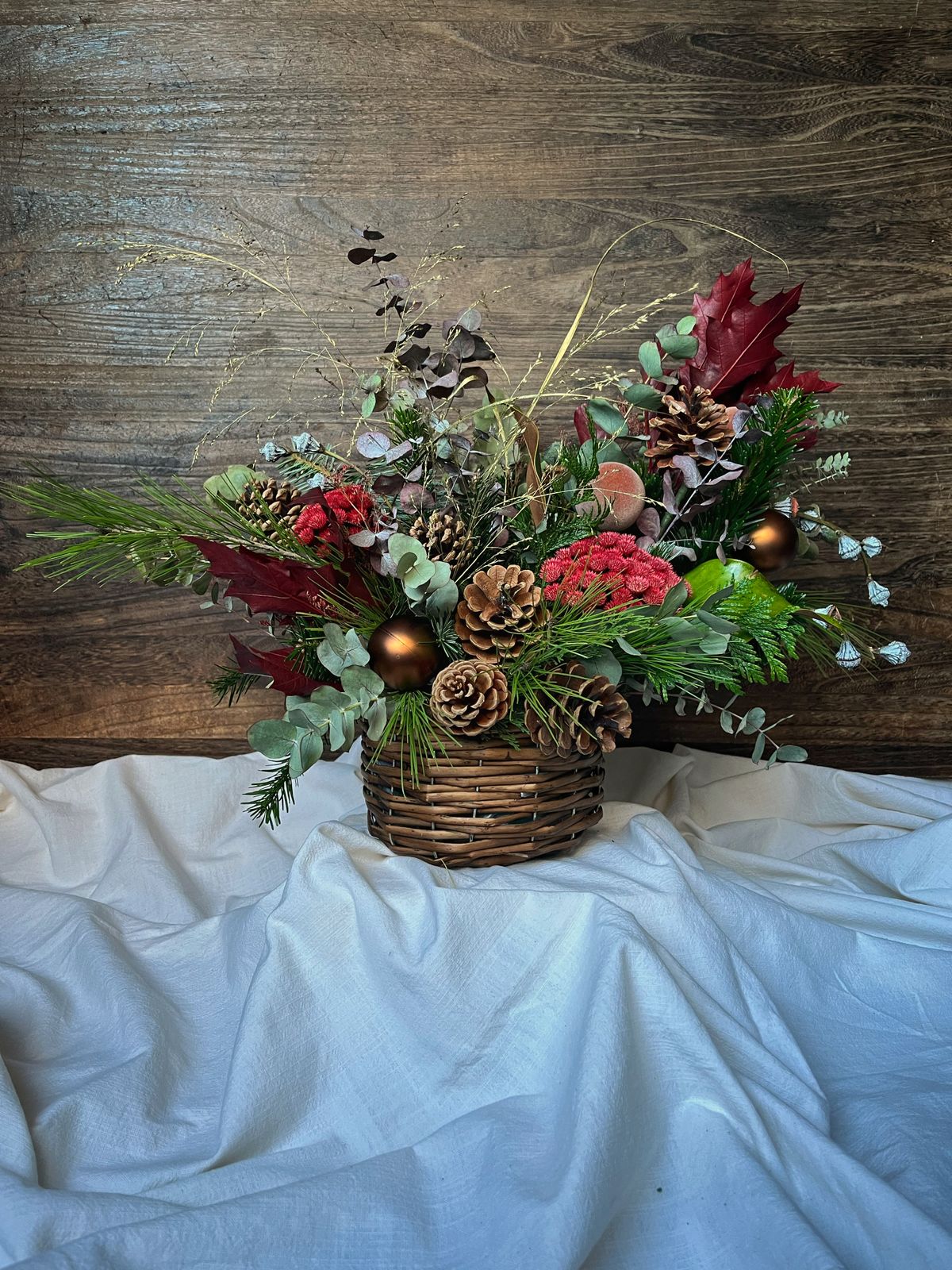Arreglo navideño pensado para aportar calidez y carácter a cualquier rincón de la casa. Los verdes invernales se mezclan con tonos rojizos y detalles naturales que le dan profundidad y textura. Las piñas, el eucalipto y las hojas de roble crean un contraste precioso, mientras que la brunia y los toques dorados suman un brillo suave que realza toda la composición sin perder naturalidad.