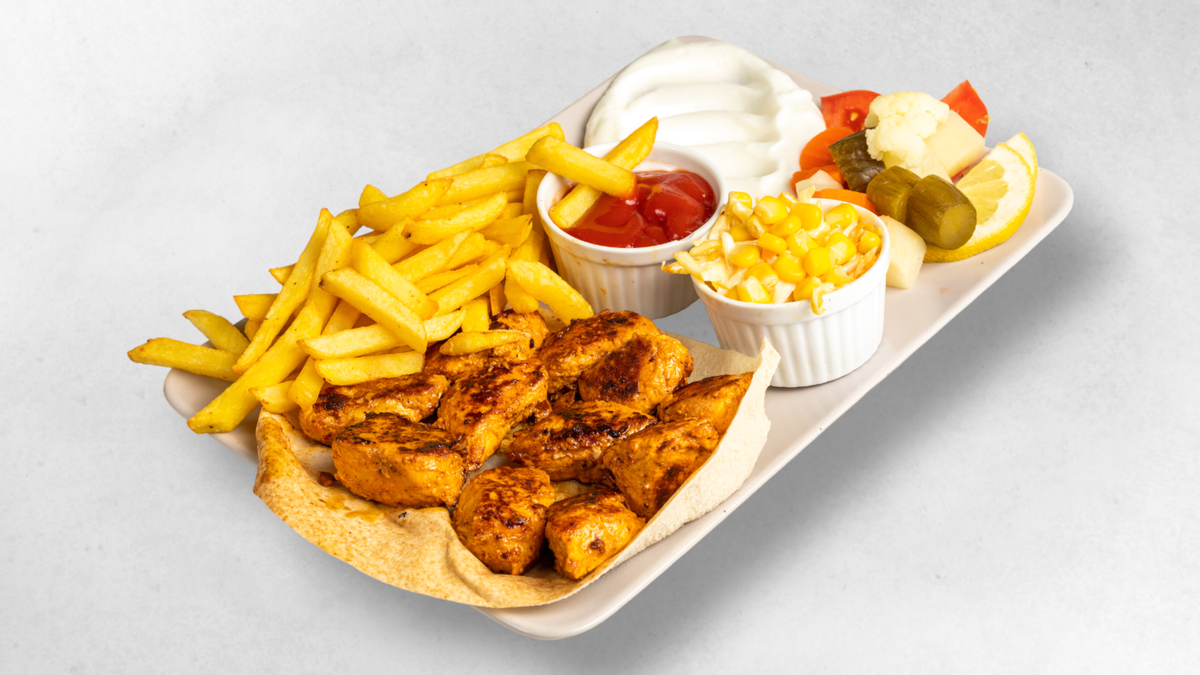 gegrillte Hühnerbrust Stücke, Pommes, Coleslaw, Tum, Ketchup, Essiggemüse