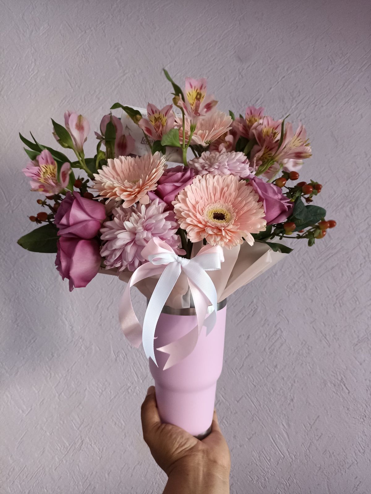Un detalle lleno de amor que será parte de sus días. Regala una sonrisa con esta fina selección floral de temporada en tonos pastel en un termo. Incluye tarjeta de dedicatoria.