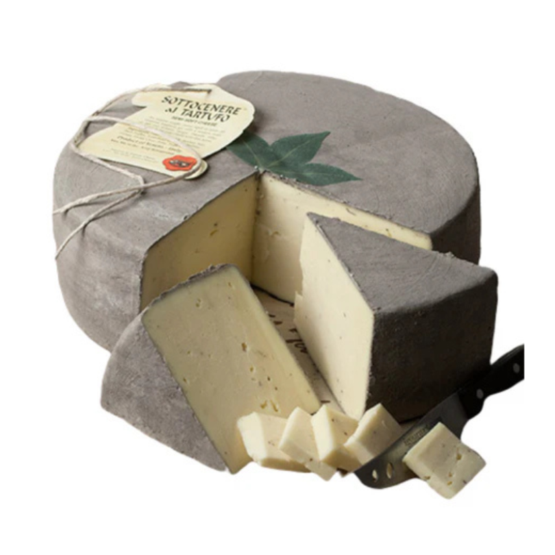 Sotto Cenere Tartufo is a luxurious Italian cheese made from cow's milk and delicately infused with black truffle, giving it a rich, aromatic flavor. Aged under a layer of ash, which contains a blend of spices, it has a semi-soft texture and a subtle earthiness that complements the luxurious truffle notes. The ash rind helps preserve its moisture while adding a unique touch to the cheese's character. Perfect for slicing onto a cheese board or melting into pasta dishes, Sotto Cenere Tartufo offers a sophisticated and indulgent taste experience.