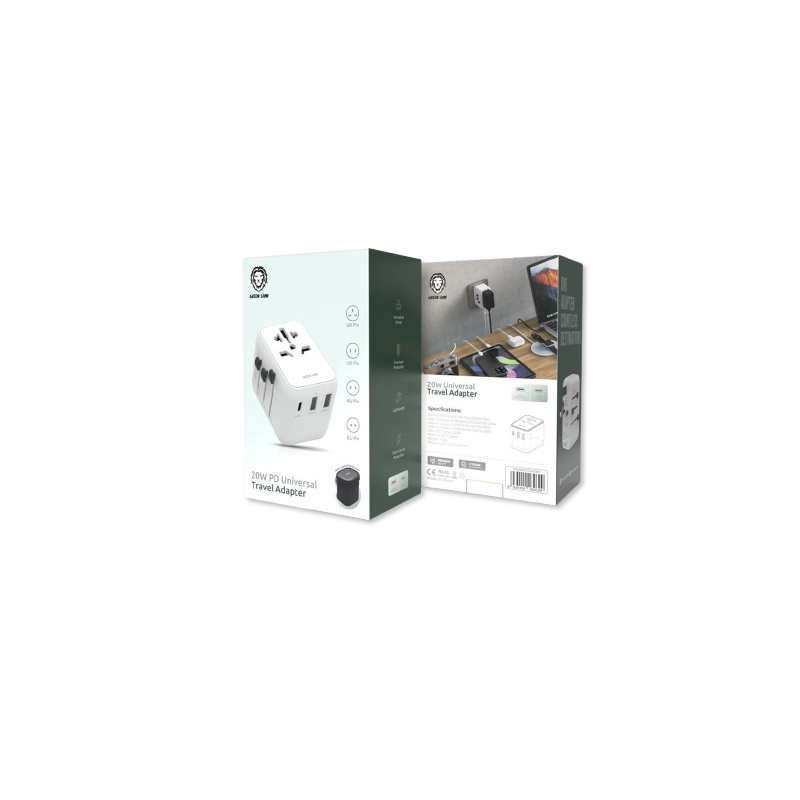 The Green Lion 20W PD universal travel adapter is a versatile device that can charge your devices anywhere in the world. The adapter has two different ports: one dual USB-A port and one USB-C port, allowing you to charge multiple devices simultaneously. This travel adapter is designed to be lightweight and innovative. It includes AU, EU, and US pins. Additionally, it comes with a carrying pouch to keep the adapter safe during travel.