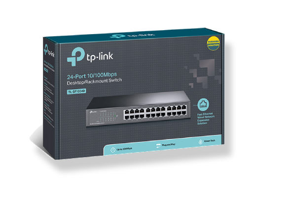 The TP-Link TL-SF1024D is a 24-port 10/100Mbps desktop/rackmount switch designed for expanding wired networks. It features 24 RJ45 ports that support auto-negotiation and auto MDI/MDIX, meaning it automatically detects the cable type and speed. This switch is known for its energy-efficient technology, which can save up to 75% of power consumption. It also supports store-and-forward switching, a 4.8Gbps switching capacity, and a 3.57Mpps packet forwarding rate.