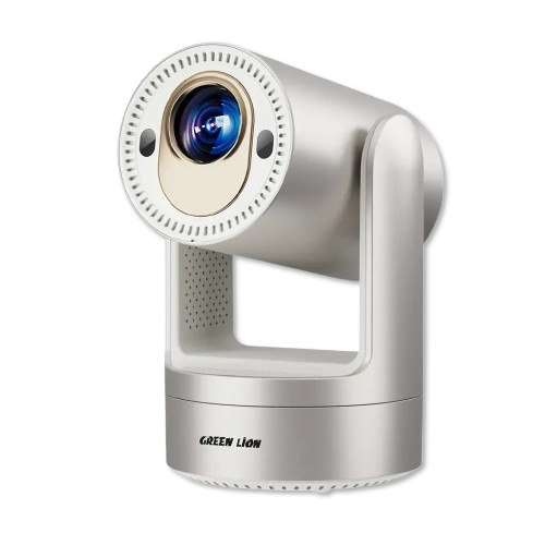 The Green Lion Prisma 4K Portable Projector, with a 5200mAh battery, boasts a 1280x720P HD resolution and supports 4K video playback via hardware decoding. It features a 1500:1 contrast ratio, 150 ANSI Lumens brightness, and a 30"-120" screen size with a projection distance of 1.2-4m. The projector runs on Android 9.0, includes features like auto keystone correction and wireless screen mirroring, and offers connectivity via HDMI, USB, Wi-Fi, and Bluetooth. Its 5200mAh battery provides up to 3 hours of playtime.