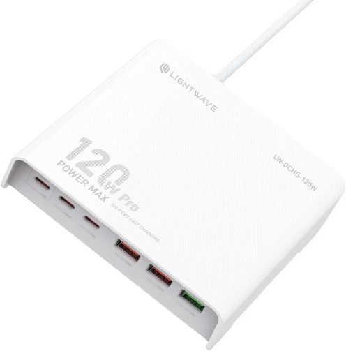 Light Wave LW-DCHG-120W Universal Desktop Charger 120W Power Rating 6-Port Fast Charging Polycarbonate Shell 100-240V, 50/60Hz 0.8A Max