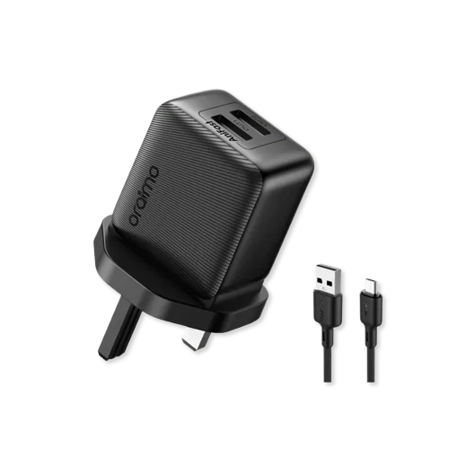 The Oraimo OCW-1121U+M53 is a dual USB wall charger kit with a focus on compact size and fast charging capabilities. It features two USB ports, each capable of delivering 5V/2.4A output, with a total output of 5V/2.4A. The kit includes a 1.0m Micro-USB cable and is designed with features like anti-sweat and fingerprint resistance, and a multi-protection system.