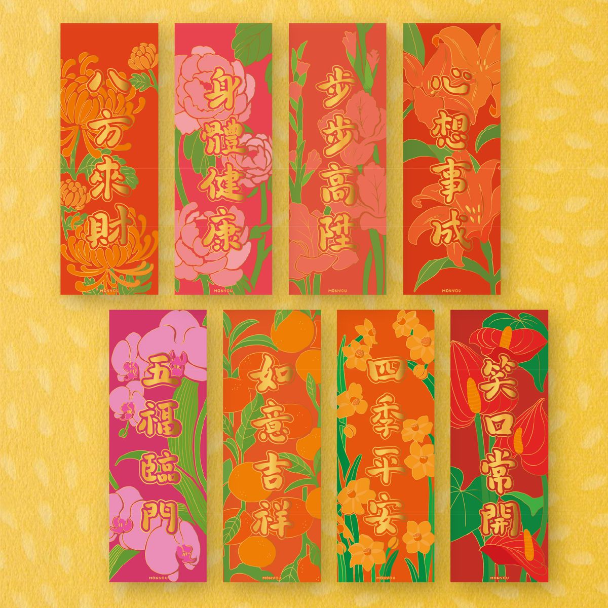 這批8款紅色橫幅靈感來自農曆新年時常見的花卉植物,搭配超吉祥的祝福語!每條橫幅獨一無二,為你的節日增添歡樂色彩。採用精緻燙金描邊工藝,營造奢華節日氛圍。每款設計蘊含深刻吉祥寓意,為你生活帶來祝福與喜悅。此系列為香港本地設計。