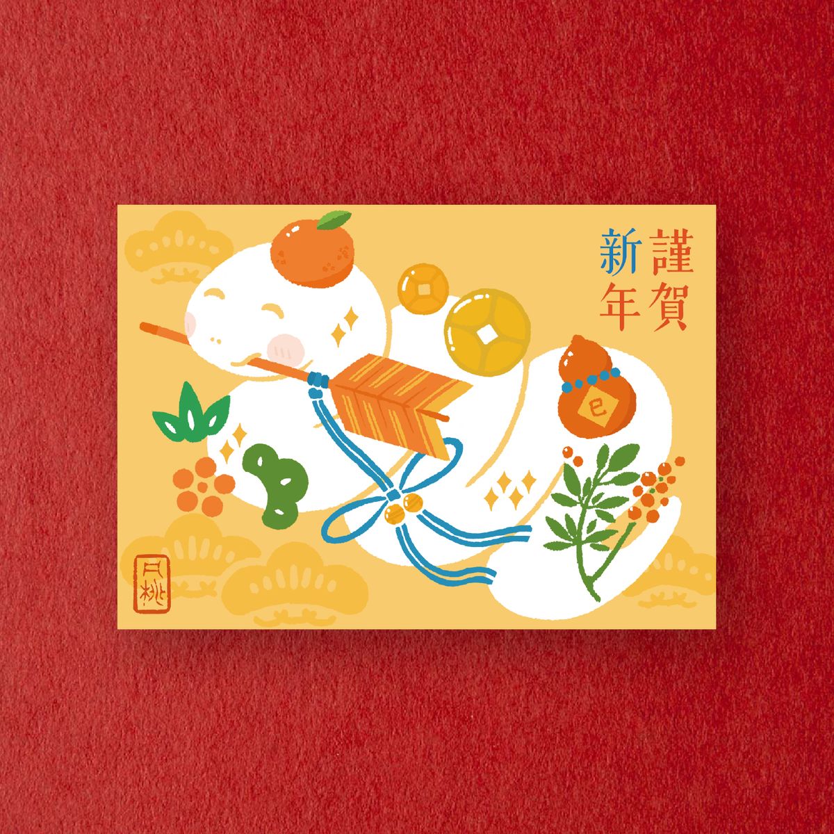 A chubby little white snake, carrying various auspicious items, comes to offer blessings: the bamboo, plum, and pine pattern symbolizing strength and longevity; the mandarin orange on the snake's head represents good luck; the arrow of exorcism commonly found in Japanese New Year paintings is held in its mouth to ward off evil and bring good fortune; the coins and gourd symbolize abundance, adorned with red winter berries to add to the festive cheer.