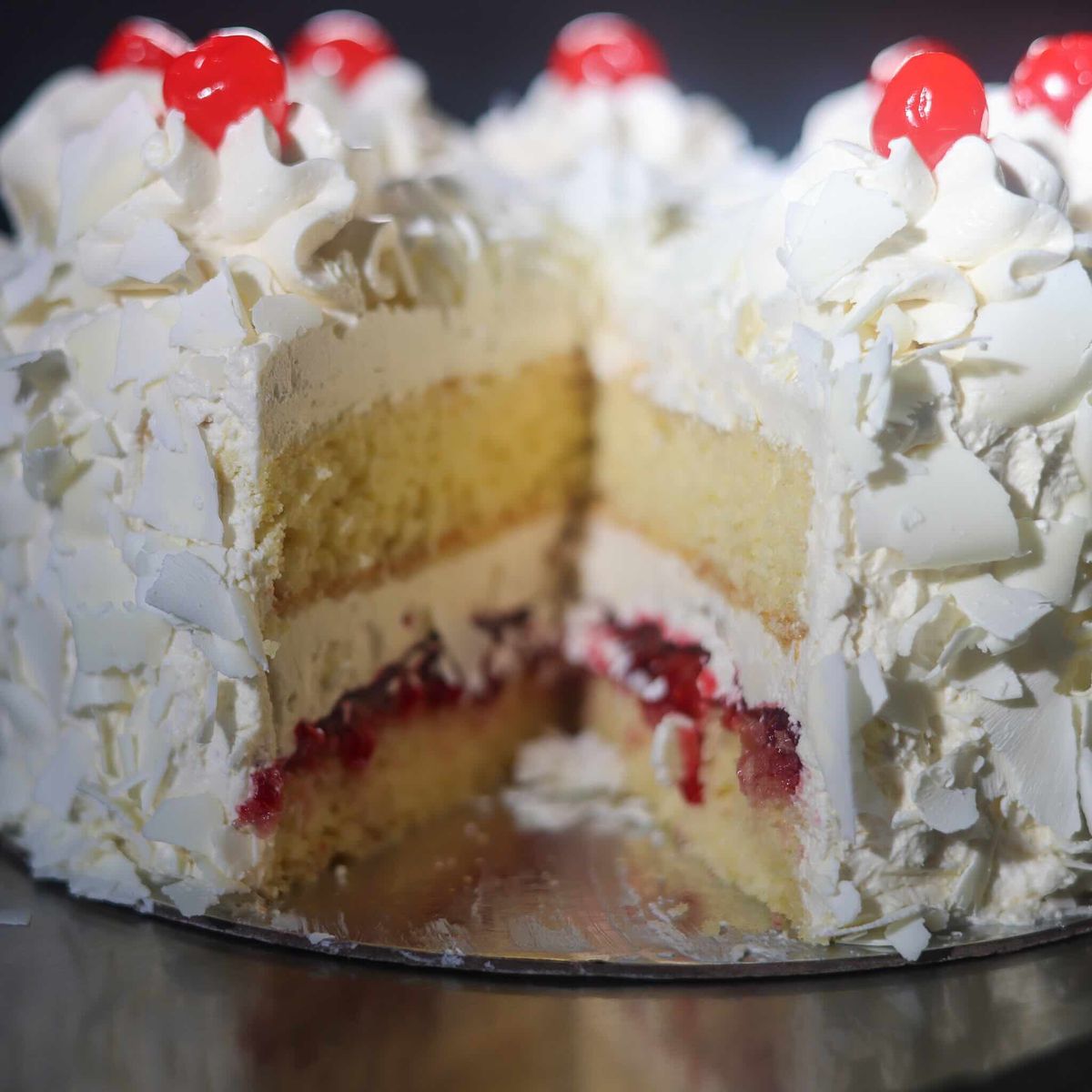 Soft vanilla sponge βοΈ, layered with whipped cream and tart cherry compote π, then crowned with swirls of cream, white chocolate shavings π«, and glazed cherries on top β this cake is a dreamy twist on the classic Black Forest.
