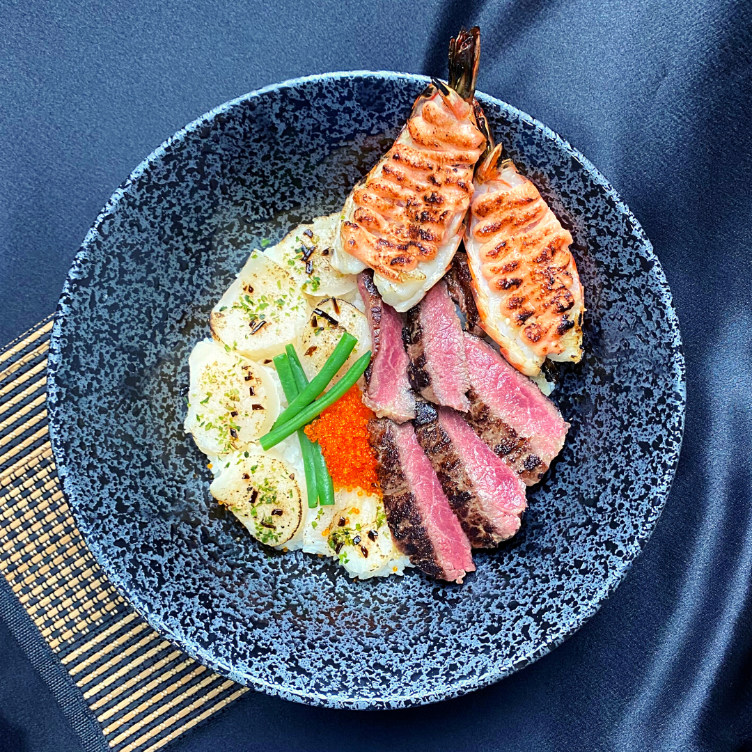 Hokkaido Truffle Seaweed Scallop, Grilled Prawn Mentaiko, Pan-Seared Sirloin Steak, Baby French Bean with Miso glaze, Flying Fish Roe topped on Premium Japanese Akita Rice