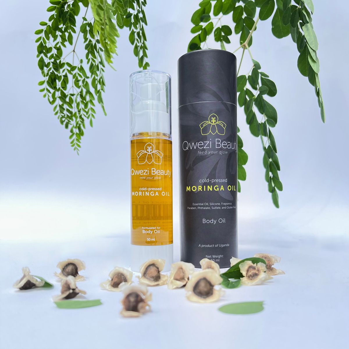 Our Virgin Moringa Oil is processed from the seed of the moringa tree grown by small organic family farms in Uganda. Pressed straight from the seed, our pure, unrefined moringa oil is free of additives and fragrance (chemical or otherwise!) Qwezi Beauty uses a cold-extraction and filtration process that preserves all the powerful benefits of pure Moringa Oil
