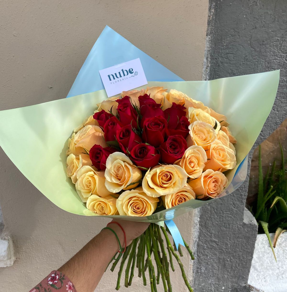 Arreglo floral de 30 rosas en papel floral.