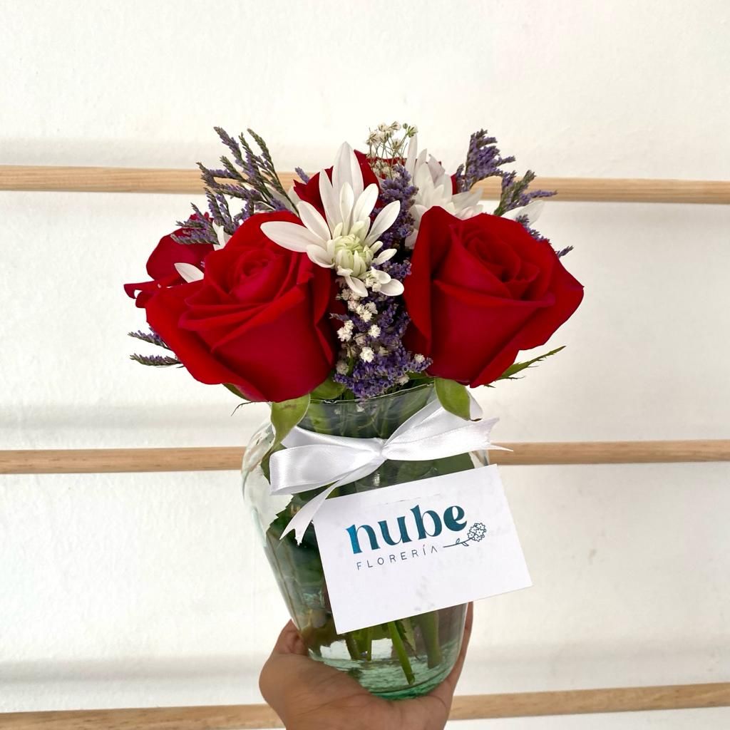 Arreglo floral en jarrón con 5 rosas y follaje.