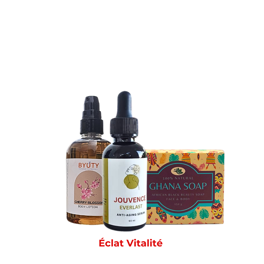 Description : Offrez à votre peau une hydratation profonde et une action anti-âge puissante avec ce package complet. Le Savon Noir Africain purifie en douceur tandis que la Glow Skin Body Lotion hydrate intensément pour une peau douce et souple. Le Jouvence Everlast lutte contre les rides et la perte de fermeté, laissant votre peau visiblement plus jeune et revitalisée. Un soin complet pour la jeunesse et l'hydratation de votre peau.