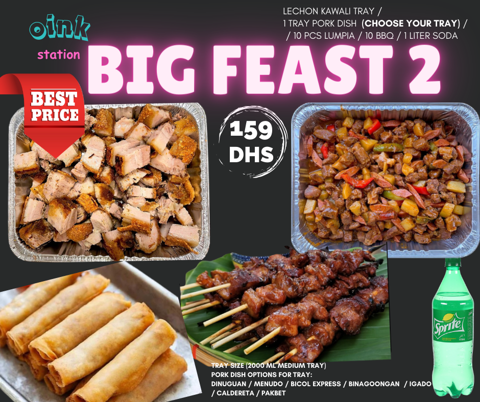 - LECHON KAWALI TRAY - 1 PORK DISH TRAY (CHOOSE 1 PORK DISH) - 10PCS BBQ - 10PCS LUMPIA - 1L SODA