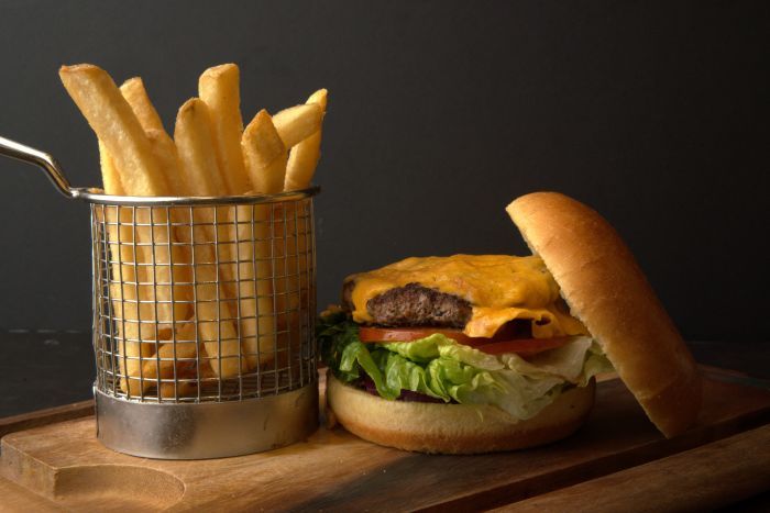 wagyu beef patty, mushroom ragout, cheese, romaine, Spanish onion, tomato, sriracha mayo, choice of fries or wedges