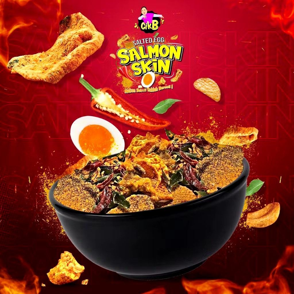 Salmon Fish Skin, salted eggs, curry leaves, chilli, butter, Milk, sugar and Salt.
