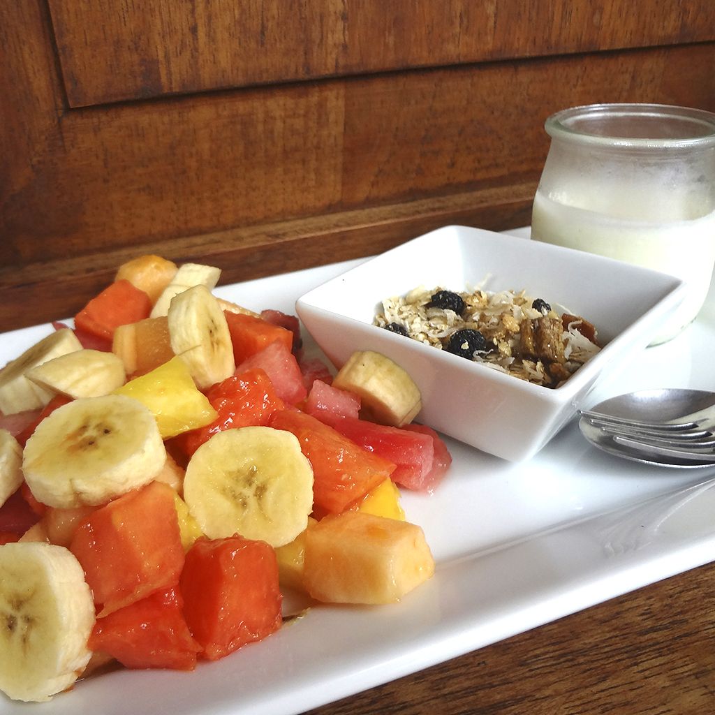 Una delicia saludable y equilibrada: nuestro yogurt griego casero, acompañado de la exclusiva granola Pan & Paz, una ensalada de frutas frescas y un toque de miel orgánica.