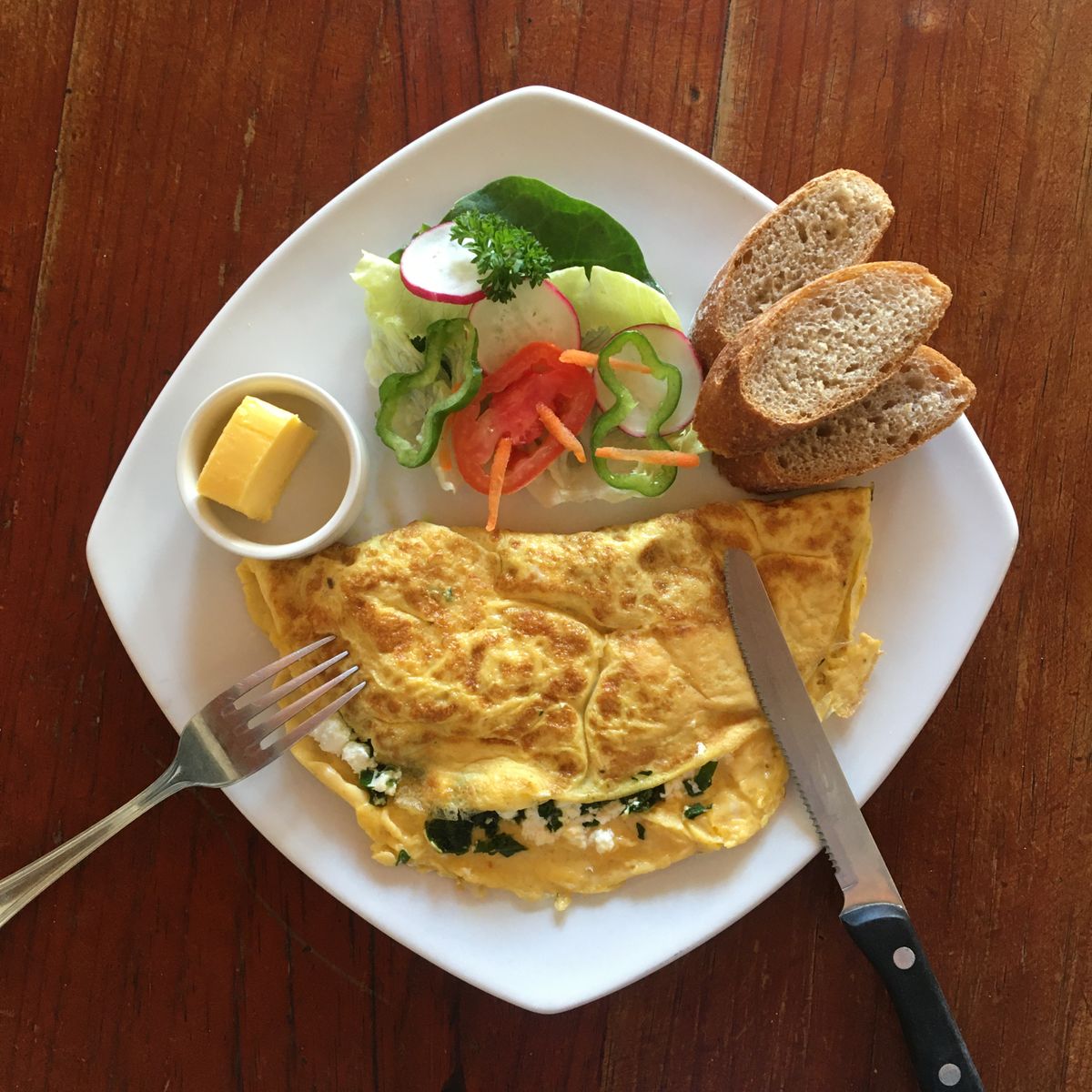 Omelette de 3 hueves con un relleno a su gusto: Espinaca & queso de cabra, Jamón & Queso, Tomate, cebolla & chiltoma, Chorizo & Queso o Natural