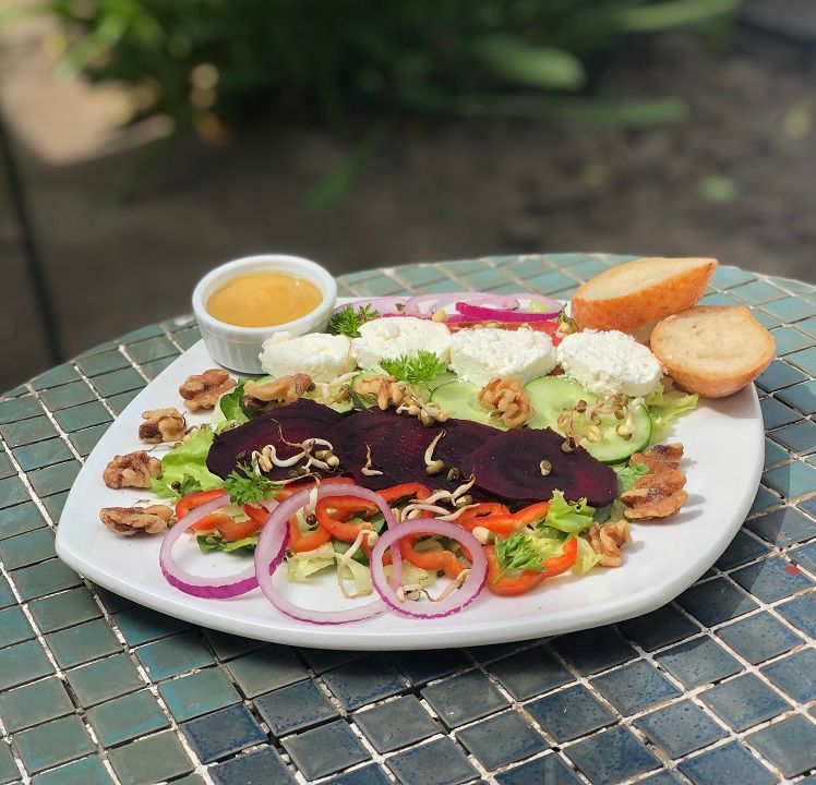 Ensalada con queso de cabra fresco, remolacha, nueces & un mostaza-miel aderezo