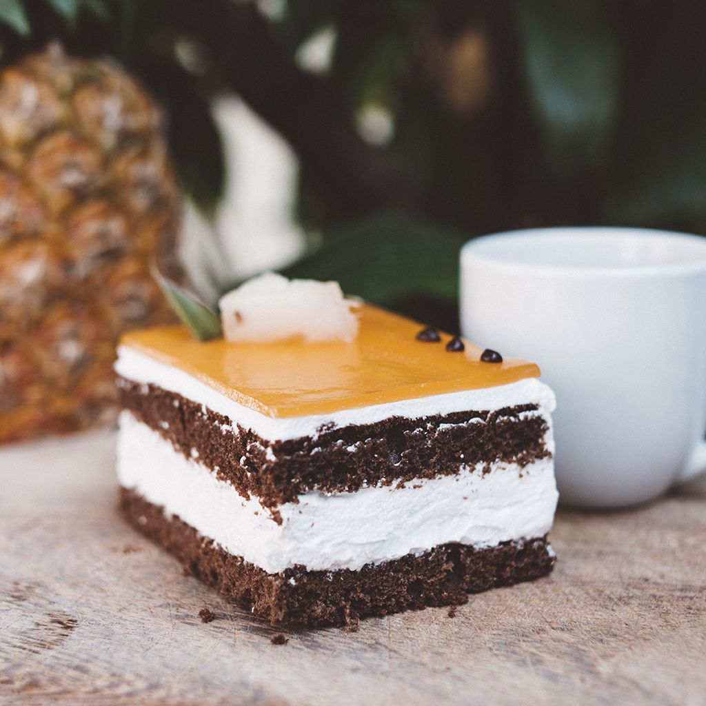 Un postre ligero por el uso de frutas frescas. Tiene un base de chocolate con crema de piña y un baño de calala