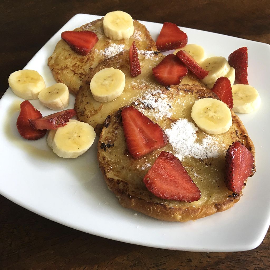 Únicas en su tipo, nuestras tostadas francesas de pan brioche son una delicia exclusiva que solo encontrarás aquí, acompañadas de frutas frescas y nuestra irresistible salsa de caramelo casera.