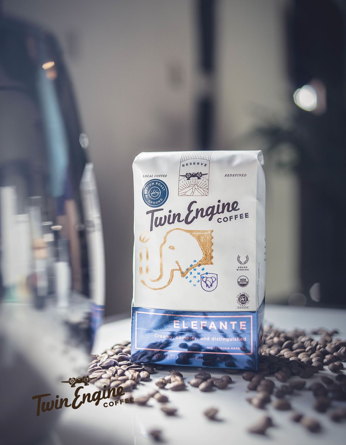 El Elefante es el primer café de Reserva de Twin Engine y está hecho de 100% de granos Maragogype. Estos granos son más grandes que los normales - por lo que se les llama de elefante. Los granos tienen gran cuerpo, cremosidad y aceites, cualidades que hacen una extraordinaria y cremosa taza de café. Algunas de las notas del café son cacao, frutos rojos, cítricos y una esencia silvestre que muestra la tierra de donde vienen.